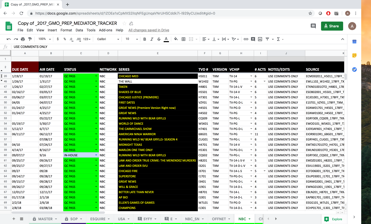 The "GMO_PREP_MEDIATOR_TRACKER" that the program operations users use to record the QC and due dates of their assets.